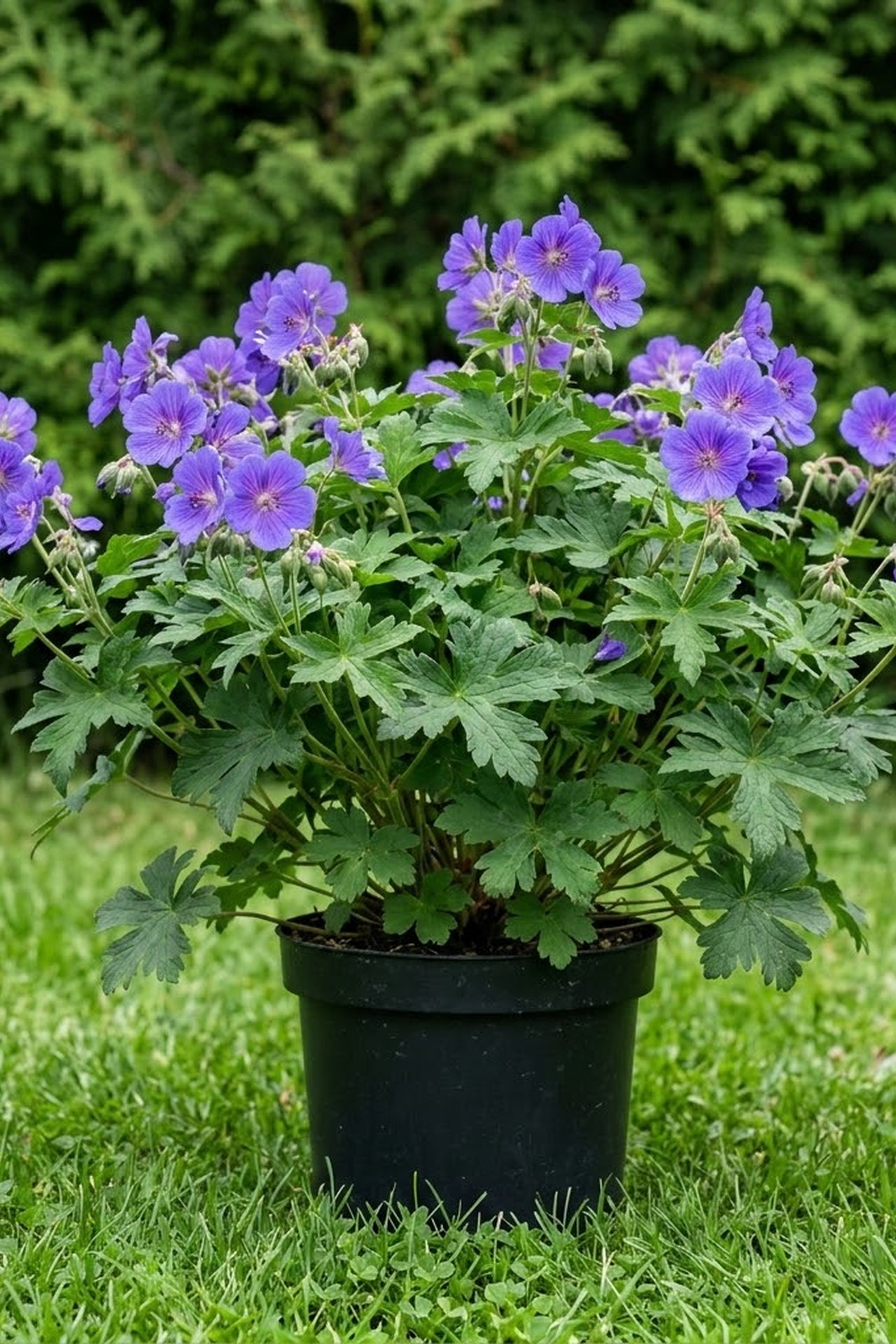 - Крупные цветки собраны в рыхлые зонтики над листвой, сине-фиолетовые с тёмными жилками.